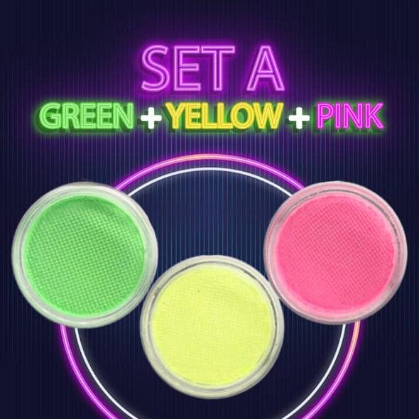 - Set A (Gelb + Rosa + Grün); Set B (Blau + Lila + Grün)