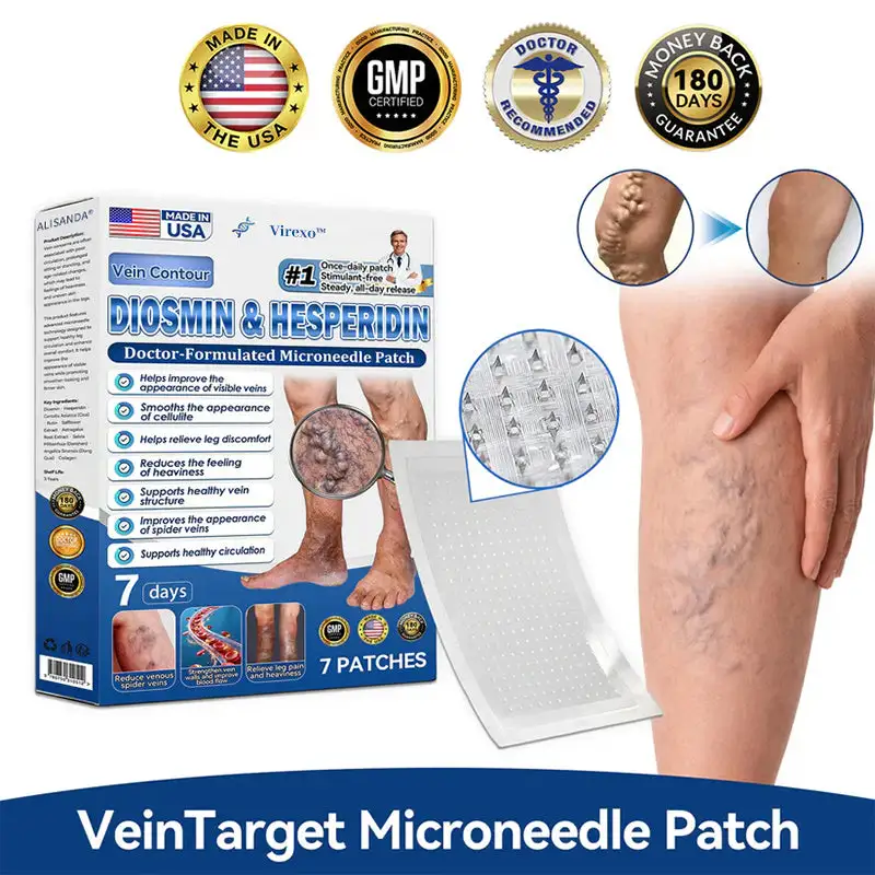 Virexo™ 𝑽𝗲𝗶𝙣 𝘾𝐨𝐧𝘁𝗼𝙪𝙧 𝙈𝙞𝐜𝐫𝒐𝒏𝒆𝗲𝗱𝗹𝙚 𝙋𝙖𝐭𝐜𝒉 𝒘𝒊𝘁𝗵 𝗔𝙙𝙫𝙖𝙣𝙘𝐞𝐝 𝐃𝒊𝒐𝒔𝗺𝙞𝐧 & 𝑯𝒆𝘀𝗽𝗲𝙧𝙞𝙙𝙞𝐧 𝐃𝒆𝒍𝒊𝒗𝗲𝗿𝙮. Es ist das erste alpine botanische Mikronadelpflaster, das eine FDA-Registrierung und GMP-Zertifizierung erhalten hat und klinisch erwiesen ist, dass es eine Erfolgsquote von 96 % bei der Behandlung chronischer Veneninsuffizienz zu Hause erreicht. Sein bahnbrechendes transdermales Abgabesystem dringt bis zu 100-mal tiefer ein als topische Cremes und sorgt für eine sichtbare Venenreduktion in nur 7 Tagen. Machen Sie teure Operationen überflüssig und stellen Sie auf natürliche Weise einen gesunden Kreislauf wieder her – und das alles bequem von zu Hause aus.